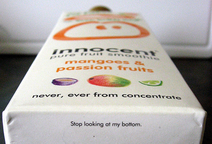 Por ejemplo, en la base de los envases de Innocent (sí leyó bien, ¡en la base!) uno puede sorprenderse con frases como: